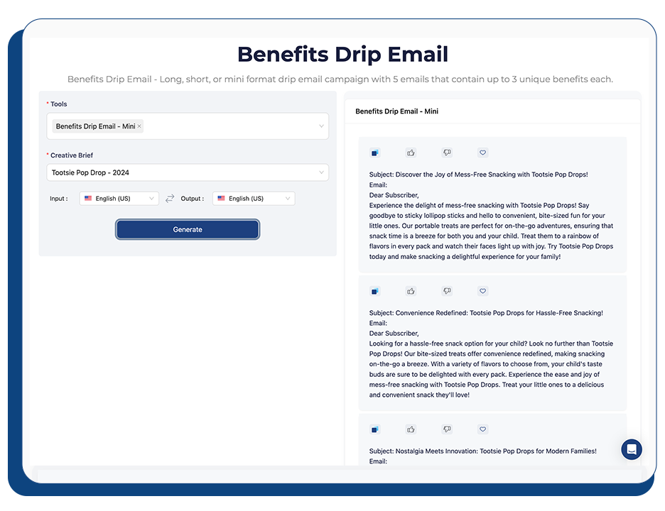 - Cohesive Campaigns: Ensure consistent and compelling messaging across single emails and entire drip campaigns.